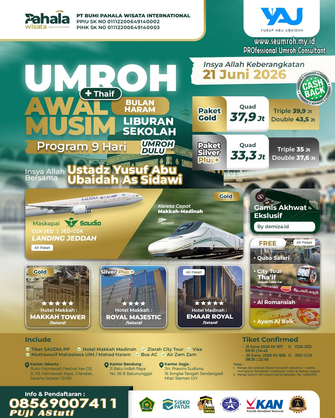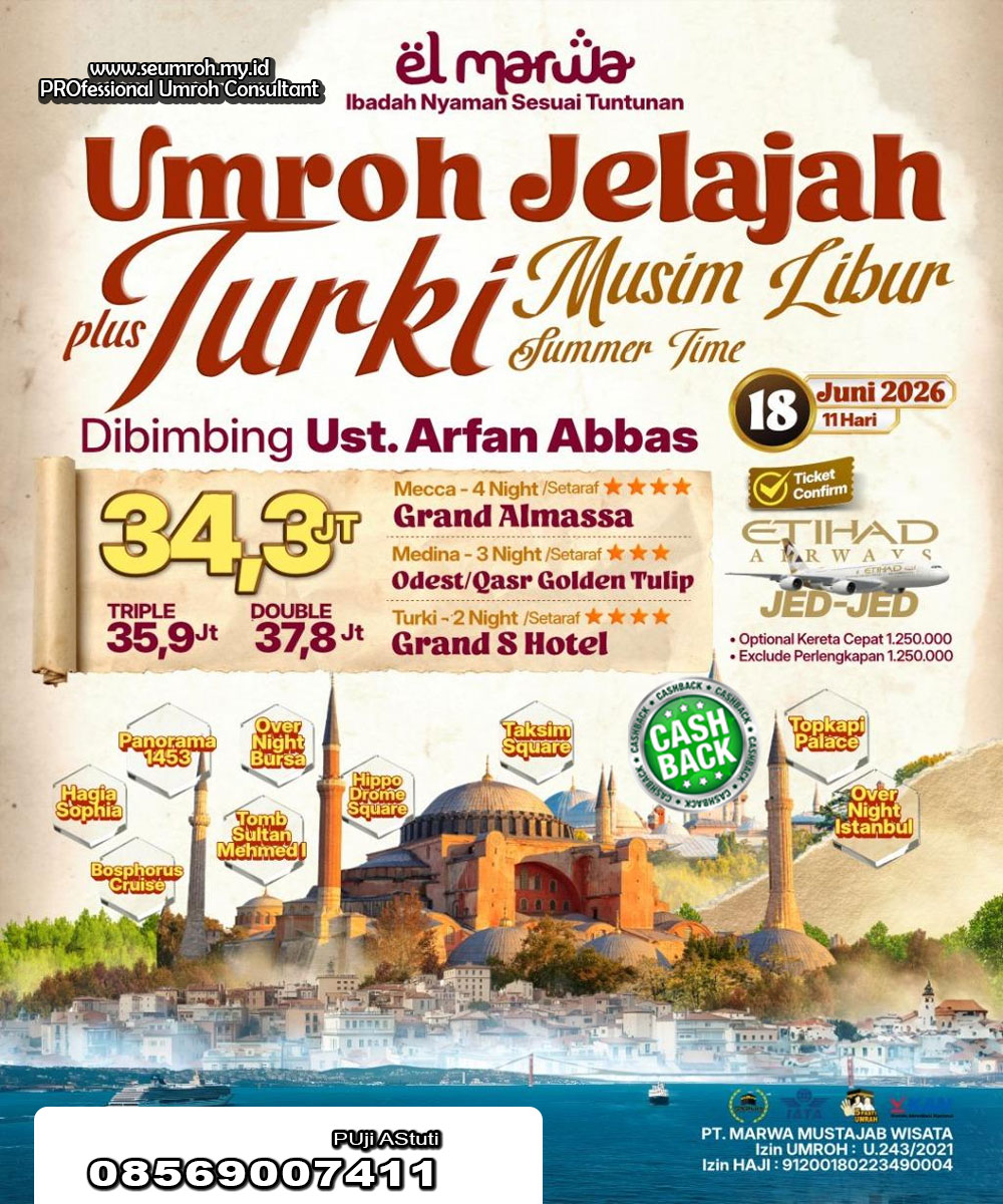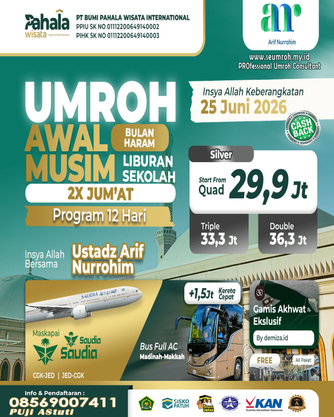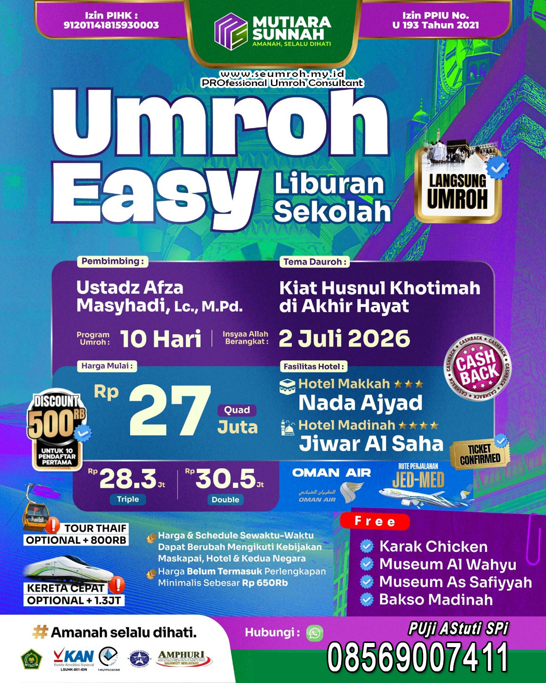 Tentukan segera budget dan pilih waktu keberangkatan umroh anda bersama kami. Jangan lewatkan kesempatan emas ini! Segera daftarkan diri Anda untuk bergabung bersama jamaah haji dan umroh lainnya. SEAT TERBATAS !!! Book seat segera sebelum kehabisan! Konsultasikan rencana perjalanan umroh Anda Bersama Travel Umroh terpercaya. Untuk detail paket, itinerary dan info lainnya hubungi kami.